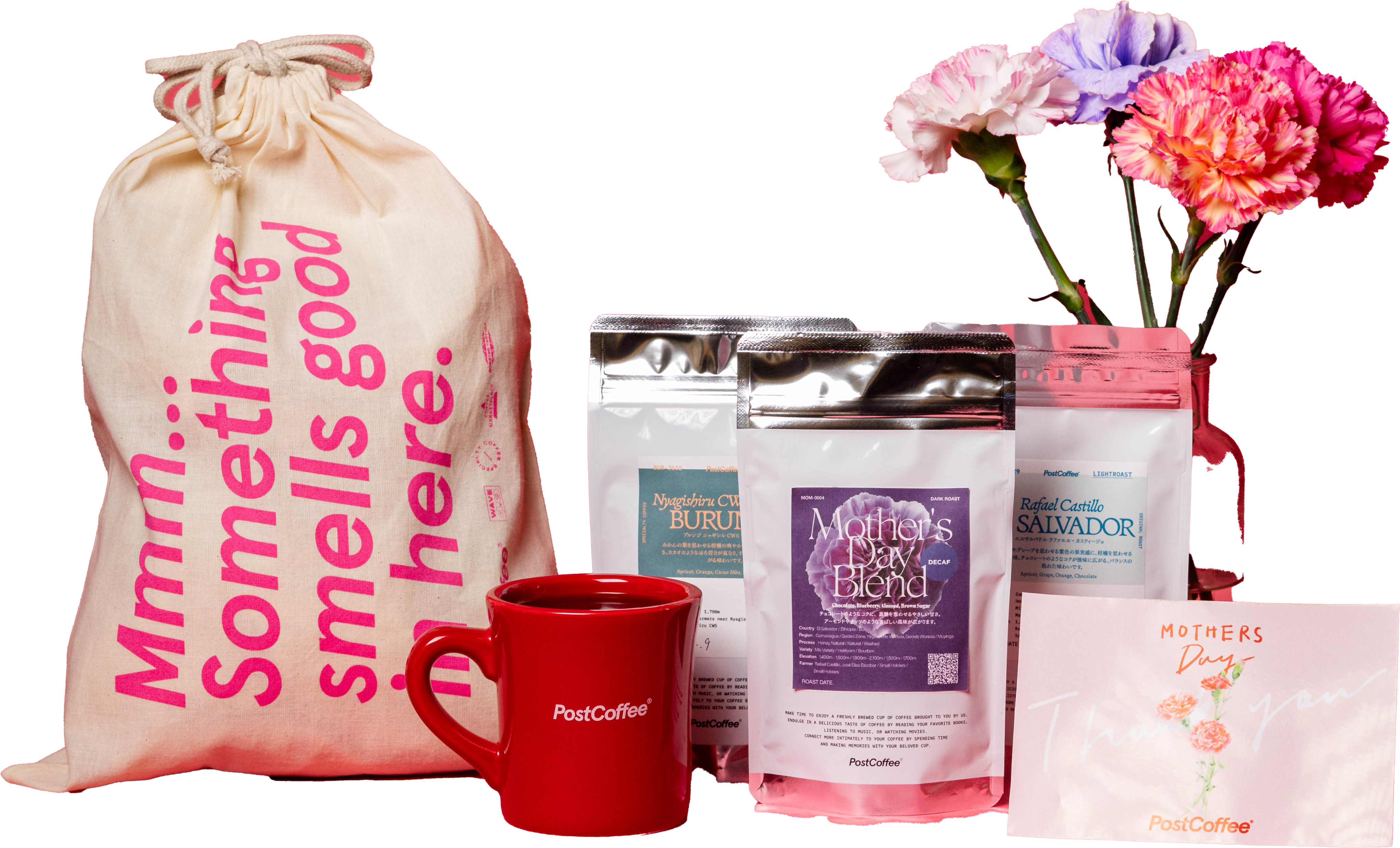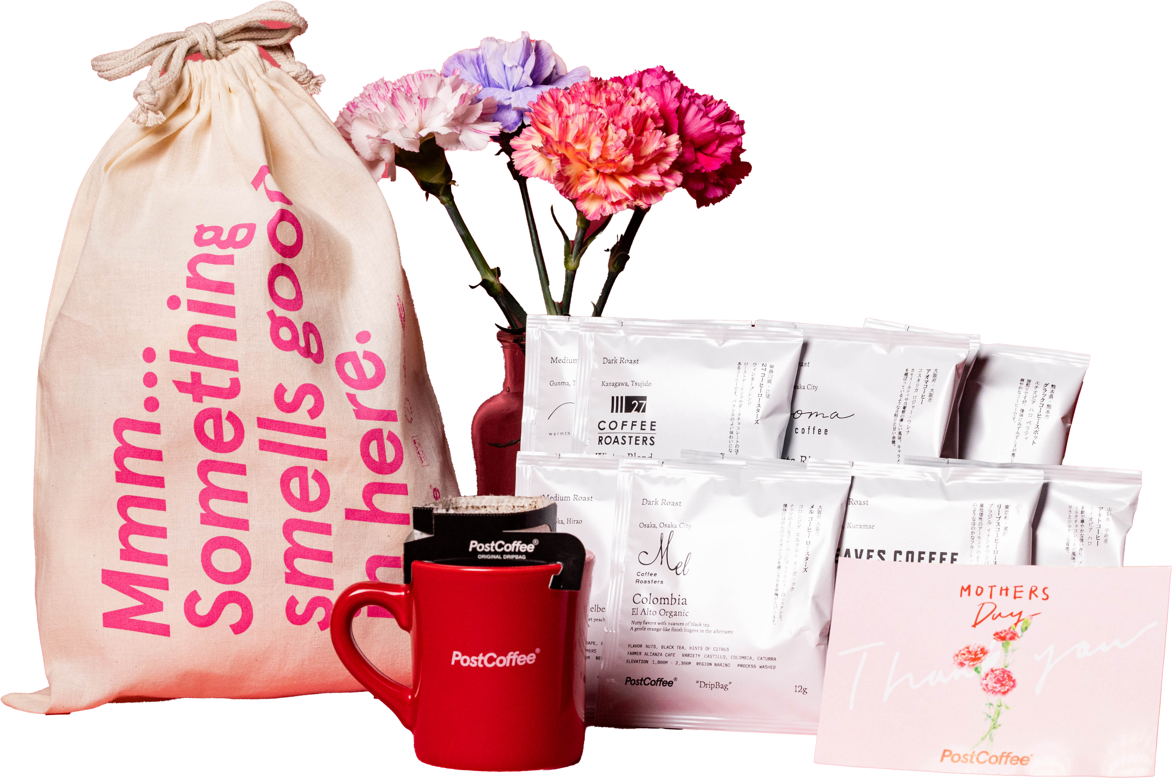 母の日限定ブレンドと旬のおすすめ豆がセットになった大満足のコーヒーギフトです。PostCoffeeのアイコニックなデザインがポイントのコットン素材のラッピングバッグに入れてお届けします。