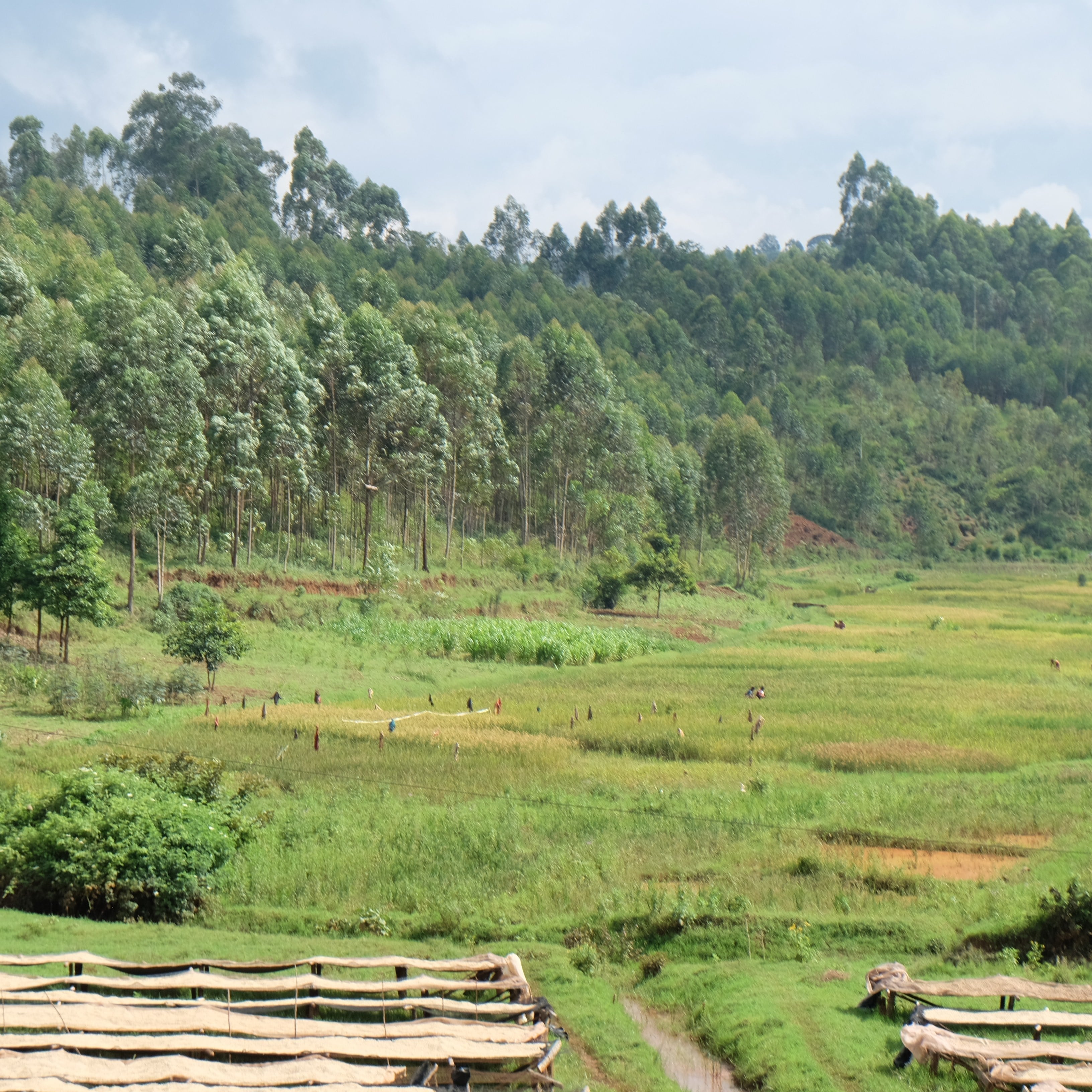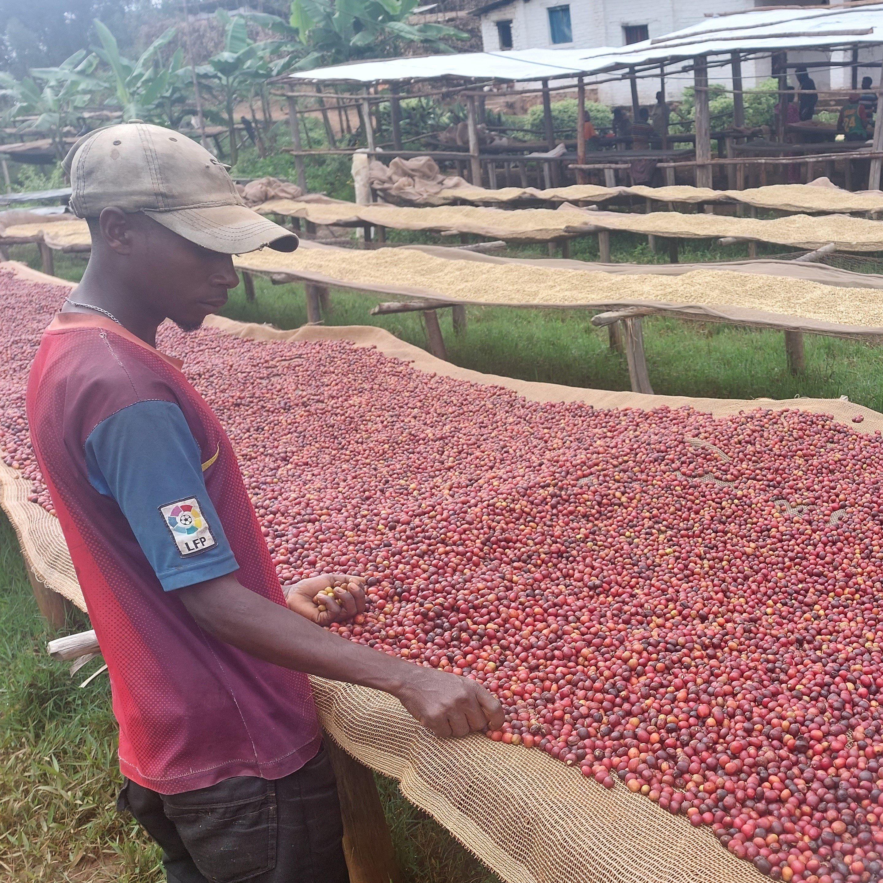 ブシンデ ウォッシングステーション(WS)は、ブルンジ北部・カヤンザ県に位置しています。カヤンザはブルンジにおけるコーヒー生産の中心地であり、標高の高い丘陵地帯が広がる地域です。1日に最大20トンのコーヒーチェリーを処理するこのWSの近くには、Kinyangona川が流れており、精製に使用する水は湧き水とこの川からの引水を使い分けています。川の影響もあり、ブシンデWS周辺はやや湿度が高く、乾燥がゆっくりと進むのが特徴です。特にナチュラルプロセスの乾燥において、この環境がポジティブに作用し、柔らかく、酸の質がよく、飲みやすいナチュラルコーヒーが毎年安定して生産されています。また、精製過程で出るコーヒーパルプは肥料として再利用され、苗木とともに周辺の小規模生産者へ無償で配布。地域全体で生産量の向上と品質改善に取り組んでいます。