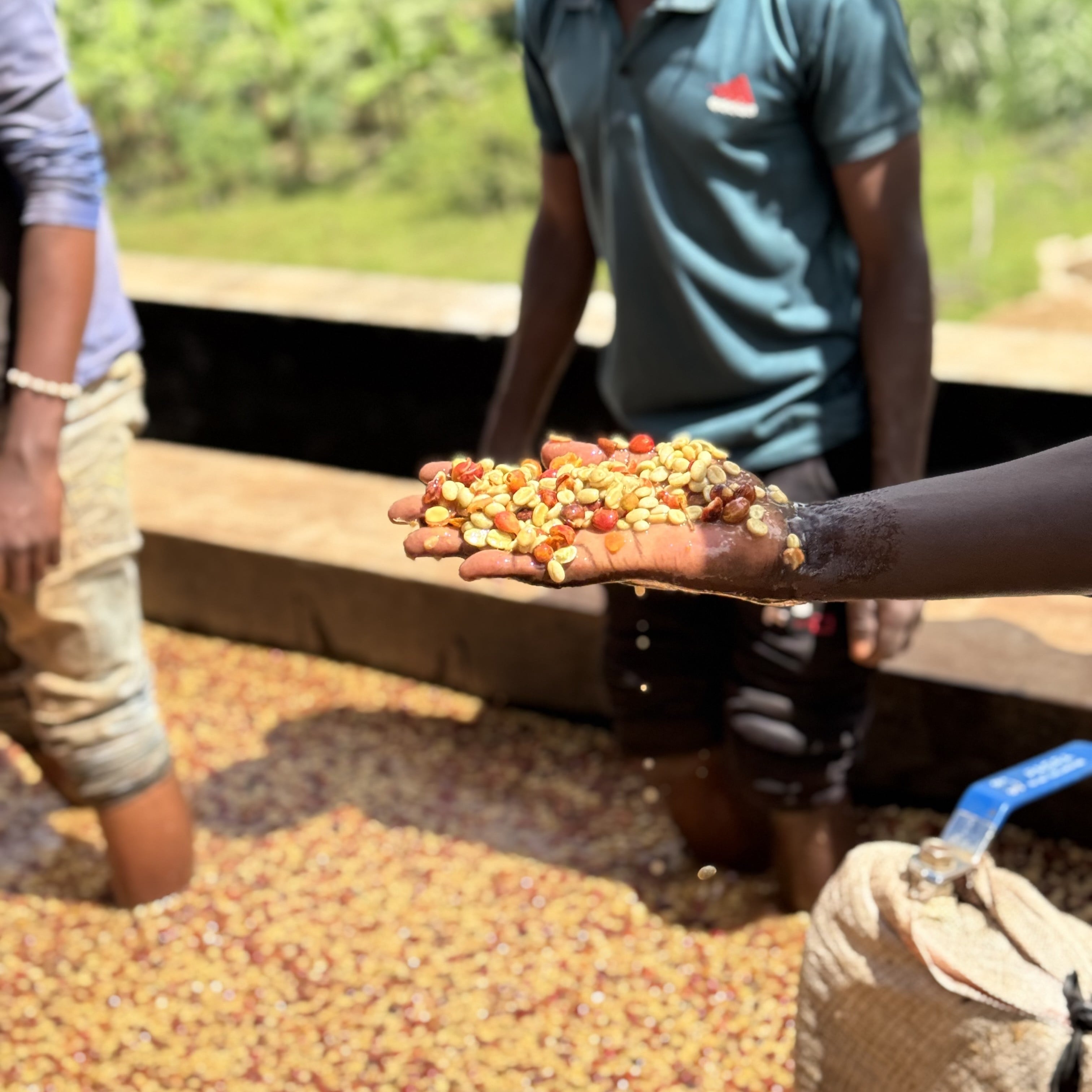 その後カナルでの水洗と比重選別によってA1〜A4の4段階にグレーディングされます。 ミューシレージを取り除くために24時間のソーキングを行い、その後ウェットパーチメントの状態で約6時間のプリドライ(陰干し乾燥)とハンドソーティングを実施。最終的にアフリカンベッドへ移し、11〜15日間かけてゆっくりと乾燥させ、水分値約11%まで仕上げられます。
