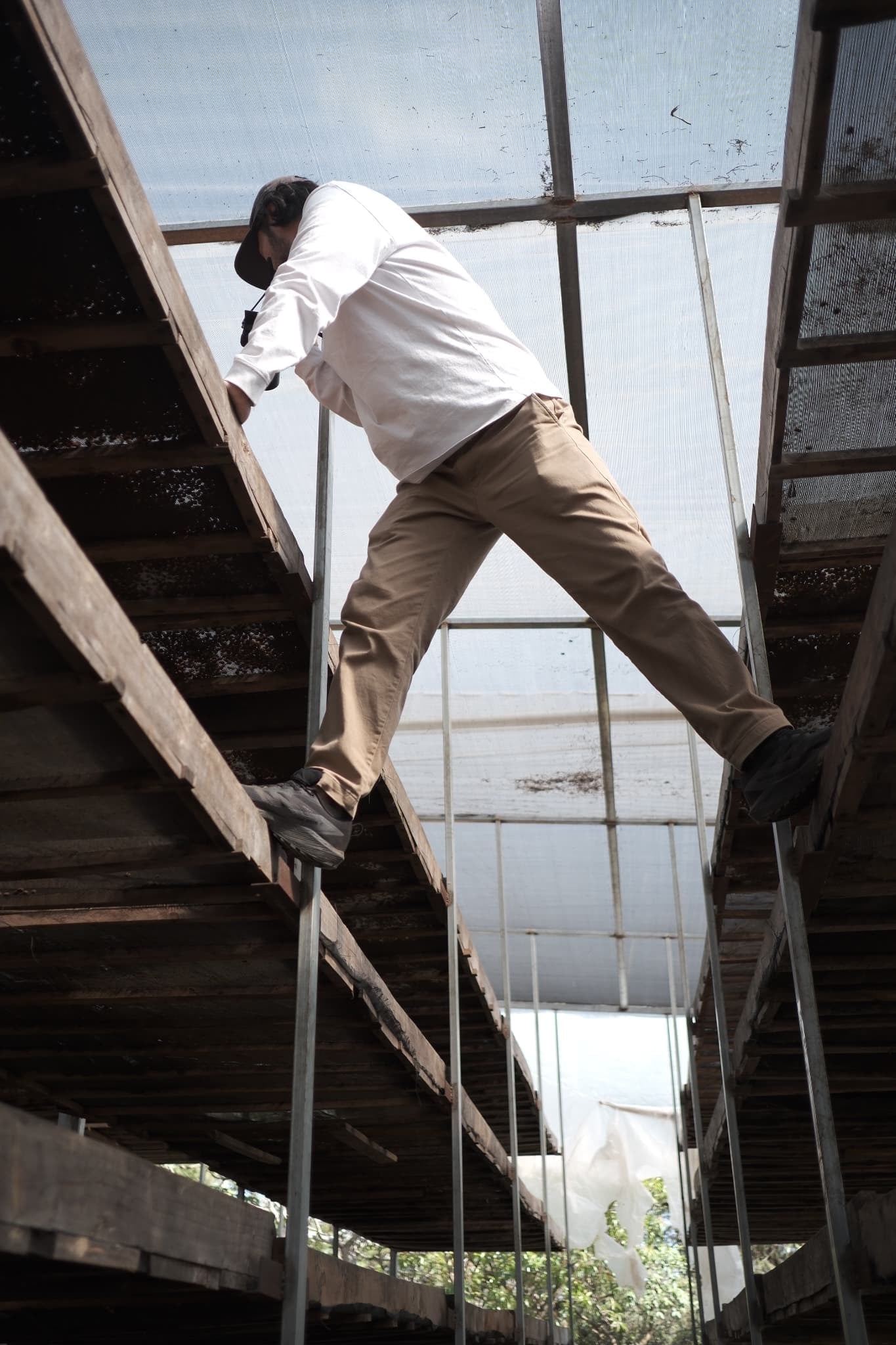 パカマラは、ハイメさんの農園でも継続して取り組んでいる品種のひとつです。大粒で個性が出やすい品種だからこそ、区画の環境や収穫のタイミングを見極めながら、丁寧に向き合い続けています。 自宅敷地内の乾燥場も、この農園を象徴するポイントのひとつです。風通しの良い乾燥棚に、遮光率60%と40%のカーテンを使い分け、ロットごとに調整しながら乾燥を進めています。ハニープロセスならではの繊細な管理が求められる中で、自然の力をうまく活かした環境づくりが印象的でした。実際に乾燥棚に上らせてもらうと、風がよく抜けていて、とても心地よい空間でした。