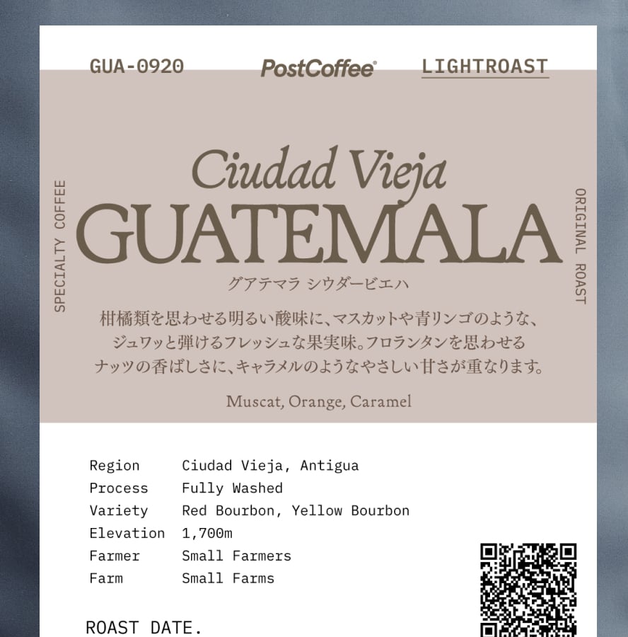 このコーヒーは、アンティグア・シウダービエハの栄養豊富な火山性土壌と、独特の微気候のもとで栽培されています。明るく透明感のある酸味と滑らかなボディ、ストーンフルーツやシトラスを思わせるフレーバーが特徴です。本ロットは、インポーターである「SYU・HA・RI」がグアテマラ現地まで足を運び、自らカッピングを行ったうえで厳選した最高品質のコーヒーです。