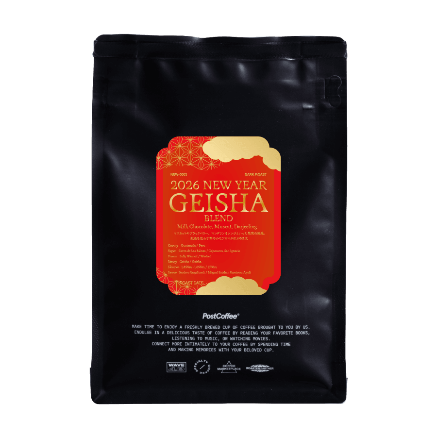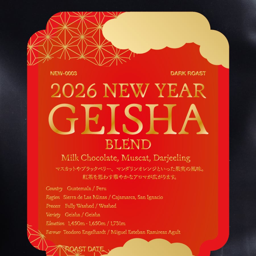 新年のはじまりにふさわしい、ゲイシャ種のみで仕上げた、特別なブレンドをリリースします。今年の「New Year Geisha Blend」は、世界的に評価の高い希少品種・ゲイシャを100%使用し、産地の異なる2種類のゲイシャを重ね合わせることで、単一農園では表現しきれない奥行きと調和を引き出した、ニューイヤー限定のプレミアムブレンドです。華やかで繊細な香りを持つゲイシャは、浅煎りのイメージが強い品種ですが、ポテンシャルの高いロットを厳選することで、深煎りにおいてもフローラルな気配と紅茶のような上品さを失いません。今年もあえて深煎りに仕上げ、ゲイシャならではの香りの余韻と、じんわりと広がる甘さ、心地よいコクを引き出しました。ブレンドには、ジャスミンを思わせる華やかさを持つペルーゲイシャ、すみれのようなフローラル感が印象的なグアテマラのゲイシャを合わせました。深煎りでありながら重たさはなく、湯気とともに立ち上る華やかな香りが、新しい一年の始まりを静かに彩る一杯。年末年始の特別な時間に、「New Year Geisha Blend」で、少し贅沢なコーヒー体験をお楽しみください。