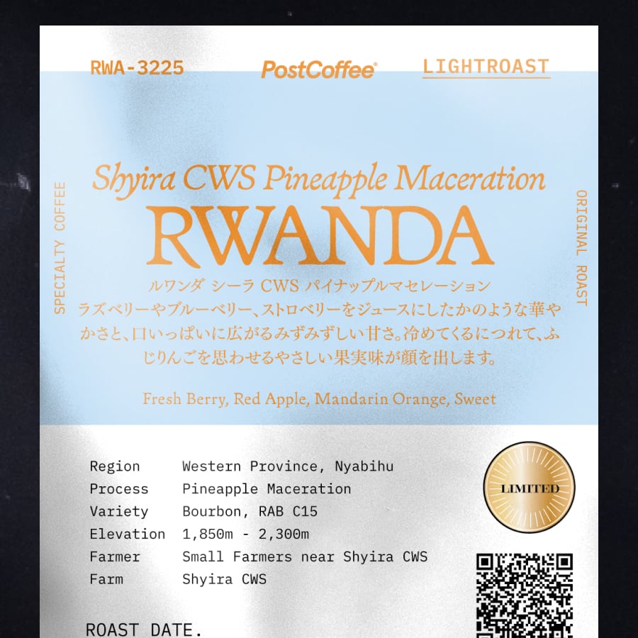 シーラコーヒーウォッシングステーション(CWS)は西部州と北部州の州境であるニャビフ郡に位置します。ルワンダのコーヒー栽培エリアとしては最高峰である2,300mの標高に加え、深い霧に覆われる山間部の谷間で生産されたコーヒーチェリーは、他のエリアとは一線を画すカップクオリティを生み出す産地です。一緒に漬け込んだパイナップルはこの地域でよく栽培されているフルーツです。入手難易度、コスト両面でサスティナブルな、シーラCWS特有の特殊精製を目指しました。