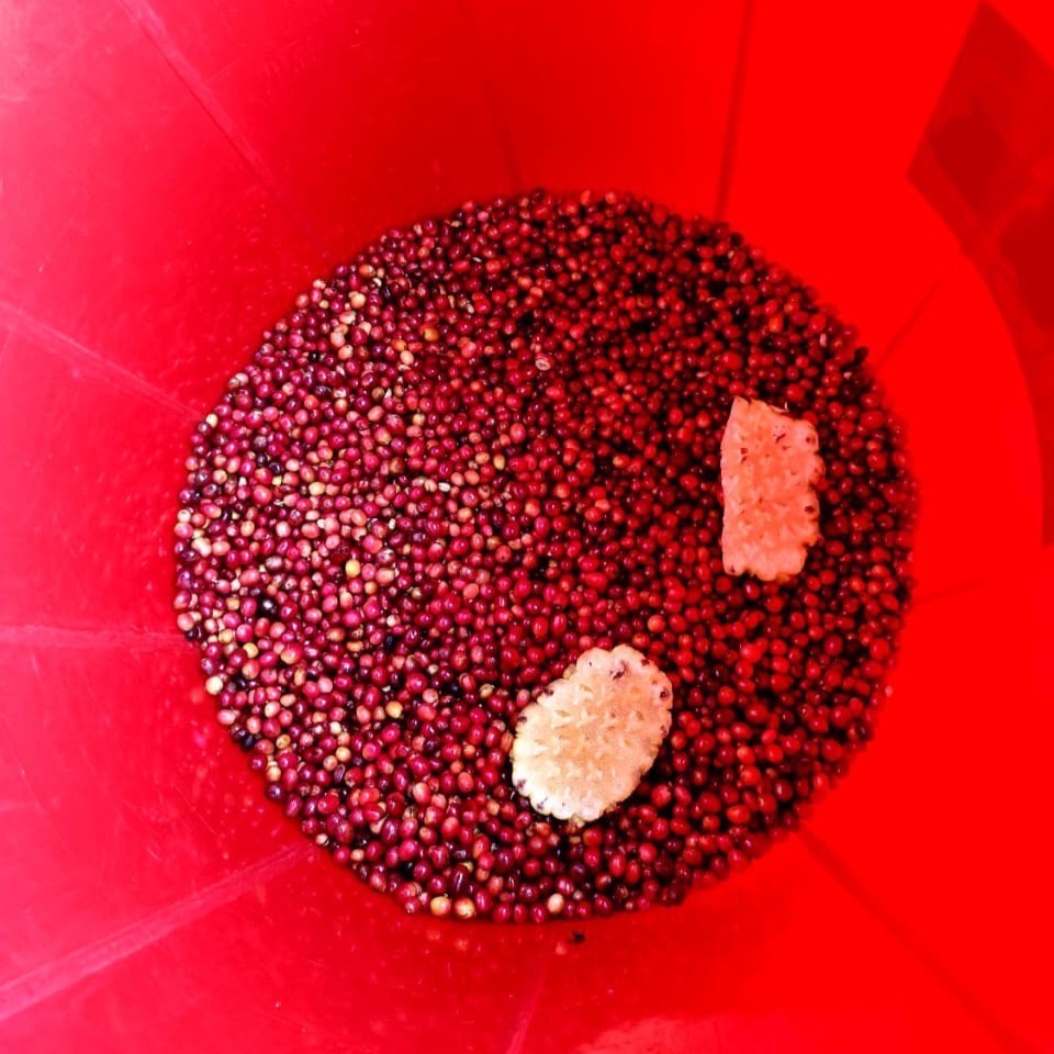 コーヒーチェリーはCWSへ運び込まれると、まず水に浮かべて比重選別を行い、不良豆を丁寧に取り除きます。続いて手選別で過熟や未熟のチェリーを取り除き、完熟した赤いチェリーだけを選別します。選び抜かれたチェリーは、145kg容量のプラスチック製バレルへ投入されます。