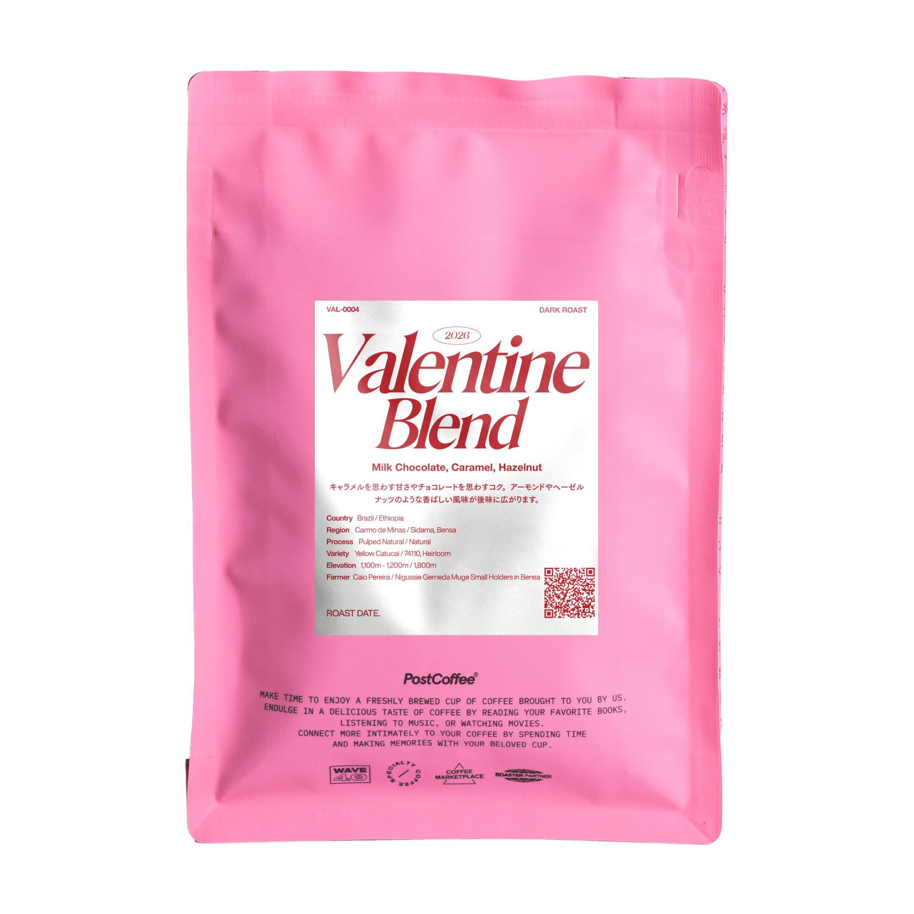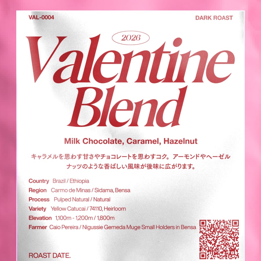 「バレンタインブレンド 2026」は、ミルクチョコレートやキャラメルを思わせるなめらかな甘さに、アーモンドやヘーゼルナッツのような香ばしい風味が重なります。飲み進めるにつれて、ブルーベリーを思わせる果実感がふわりと広がり、甘く心地よい余韻へとつながります。そのままでももちろん美味しく、チョコレートやクッキーなどの焼き菓子と合わせても楽しめるよう、ブラジルとエチオピア、2種類のナチュラルプロセスの豆をブレンドしました。コクのある甘さが特徴の「Brazil Caio Pereira Yellow Catucai Pulped Natural」をブレンドの軸に、「Ethiopia Sidama Natural」の華やかさとベリーの果実感を重ね、深煎りでも重たくなりすぎないバランスを目指してローストプロファイルを組み立て焙煎しています。