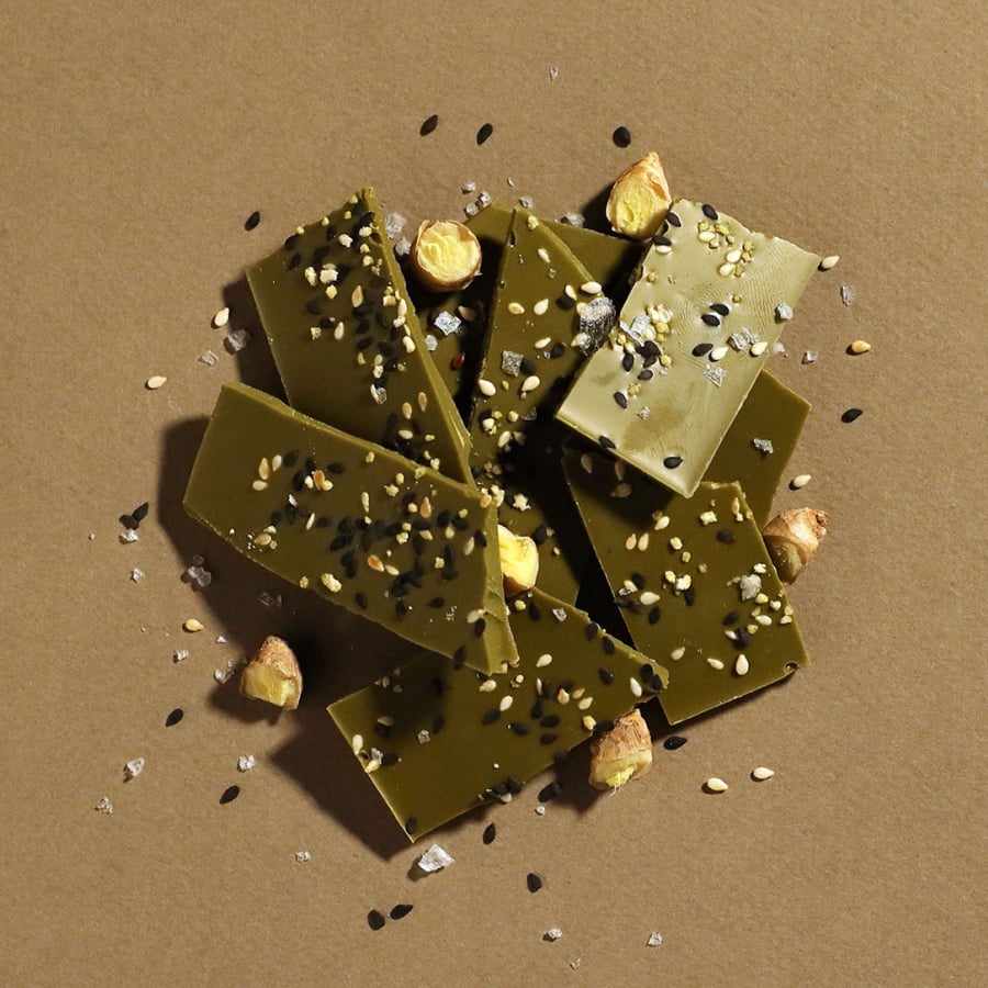 コーヒーと同様に、オニキスコーヒーラボはカカオを細心の注意を払って焙煎し、オールドワールドスタイルのチョコレート作りに向かっています。このチョコレートバーは、彼らの「テロワール」コレクションの一部です。 エクアドル産カカオバターを使用したホワイトチョコレートに、鹿児島県産の有機抹茶を贅沢に合わせ、抹茶の旨みと香りを主役に仕立てました。香ばしく焙煎したごま、ひとつまみの塩、ジンジャーハニークリスタルがリズムある口当たりを添え、バレンタインに心地よい余韻と印象を残す一枚です。
