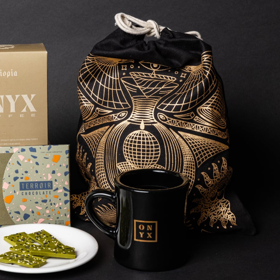 世界屈指のロースタリー ONYX COFFEE LAB のコーヒーに、テロワールを映し出すチョコレートバー、そしてオリジナルのギフトバッグを組み合わせました。
