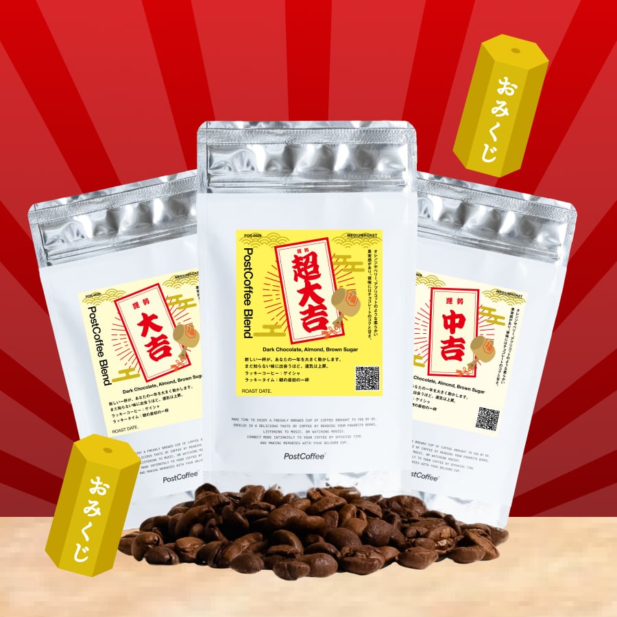 超大吉には、ゲイシャ種のコーヒー豆と3,000円分のお年玉クーポンをご用意、大吉には、希少品種のコーヒー豆と1,500円分のお年玉クーポンが当たります。