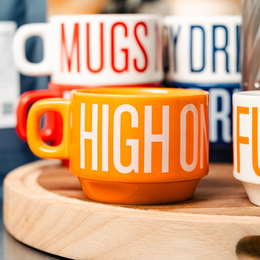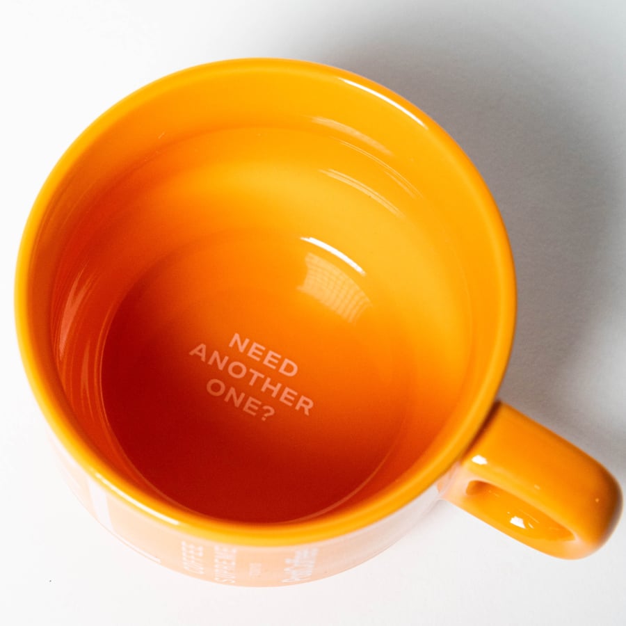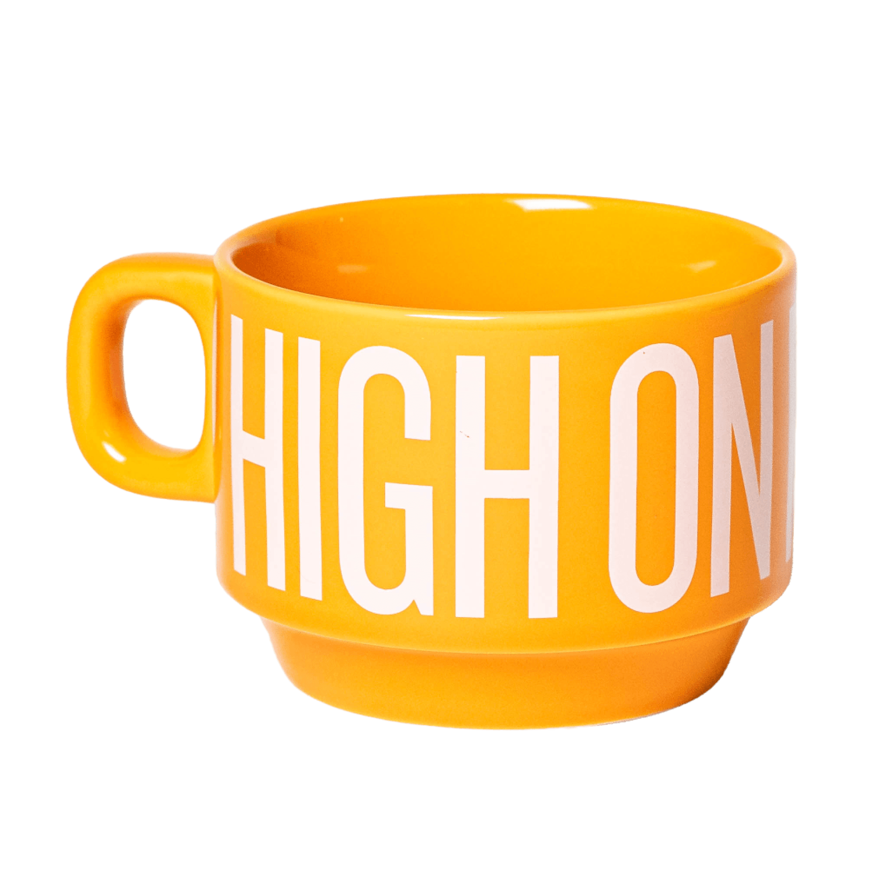 カップ側面には、< HIGH ON FUEL >、マグカップの底には、< NEED ANOTHER ONE? > の文字が施されています。