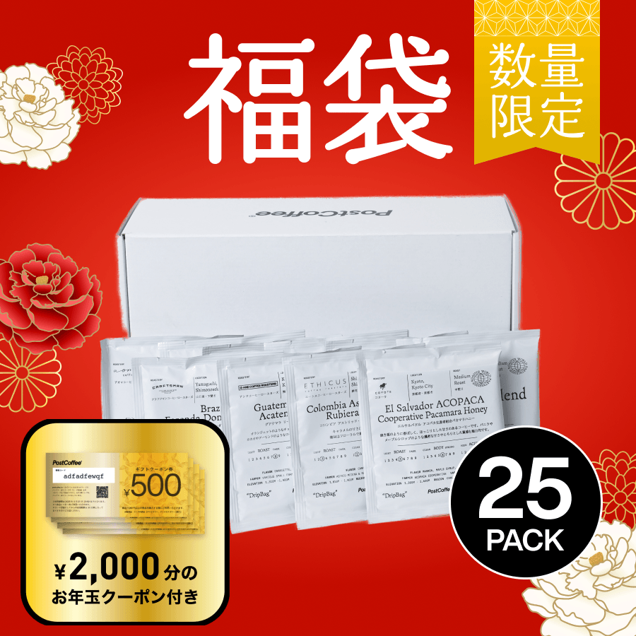 毎年ご好評いただいているPostCoffeeの福袋、今年はさらにパワーアップ! 全4種類のラインナップで、より幅広いニーズにお応えします。 お得に美味しく新年を彩る2種類の「コーヒー豆福袋」をはじめ、どこでも手軽に楽しめる「ドリップバッグ福袋」、そして届いたその日から充実したコーヒー時間を始められる「スターター福袋」まで、多彩な内容をご用意。 一年の感謝を込めて、どれも“超お得”で大満足のボリュームに仕上げています。2026年のコーヒーライフを、ぜひ福袋でお楽しみください。