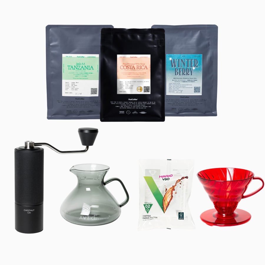 届いたその日から充実のコーヒーライフが楽しめる、新年に相応しいスターター福袋を数量限定でご用意しました! コーヒーは、PostCoffee自社焙煎豆からゲイシャ種をはじめとした新年を彩る豪華な3種類をセレクト! 主役のギアたちは、人気のタイムモア ハンドグラインダー、PostCoffeeのアイコン的ドリッパーV60SP、MUVNAコーヒーサーバー、ペーパーフィルターと贅沢なラインナップでお届け。