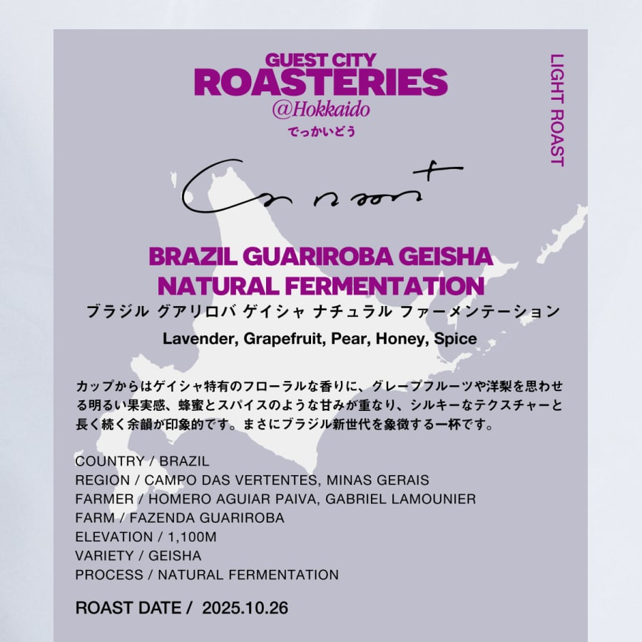 ブラジル・ミナスジェライス州、カンポ・ダス・ベルテンテス地区の標高1,100mに位置するグアリロバ農園。5世代にわたり家族で継承されてきた農園で、生産者たちは持続可能な農業と革新的な発酵技術を融合させ、毎年ブラジル国内外から高い評価を得ています。このゲイシャ・ナチュラルロットは、完熟チェリーを手摘みで収穫後、72時間の密閉バイオリアクター内で自然発酵を行い、その後25日間のシェードドライによってじっくりと乾燥。発酵由来の複雑なフレーバーを最大限に引き出しながら、透明感のあるクリーンな質感を実現しました。