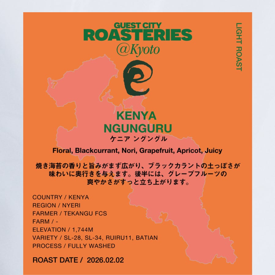 ケニア・ニエリ県に位置するNgunguru(ングングル)ファクトリーは、New Tekangu Farmers’ Cooperative Society(FCS)に属する精製所のひとつです。 Ngunguruという名前は現地の言葉で「薪が豊富にある場所」を意味します。 この地域は、隣接するキリニャガと並び、密度が高く、複雑で風味豊かなコーヒーの産地として知られています。 Tekangu FCSは、Tegu、Karogoto、Ngunguruの3つのファクトリー名を組み合わせた名称で、現在は4つのファクトリーを運営。周辺の小規模農家が栽培したチェリーを持ち込み、共同で精製を行っています。 標高1744mの粘土質ローム土壌で育てられたコーヒーは、SL28、SL34、Ruiru11、Batianといったケニアらしい品種構成。 開花は2〜3月、収穫は10〜12月に行われます。 収穫されたチェリーは農家の手で選別され、完熟したもののみを使用。パルピング後、タンクで一晩発酵させ、P1〜P3およびライトにグレーディング。その後、10〜16日間アフリカンベッドで天日乾燥されます。