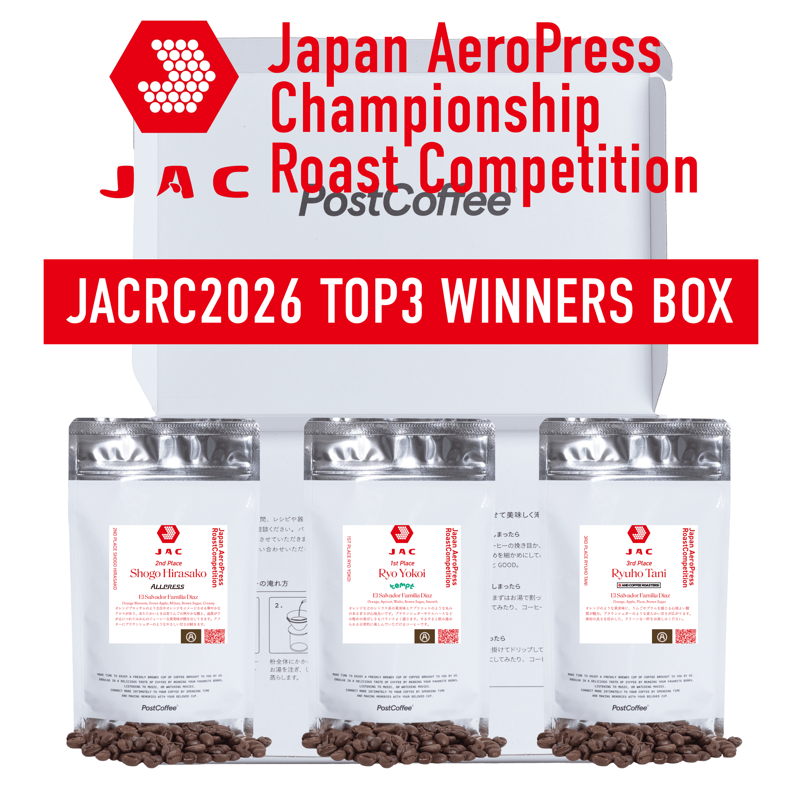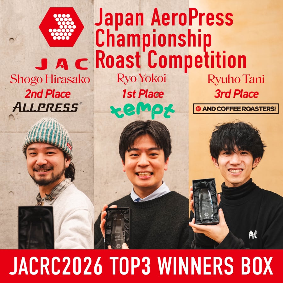 JAC(Japan AeroPress Championship)への協賛を記念し、同大会内で開催されるローストコンペティション、JAC Roast Competition(JACRC)にフォーカスした特別なコラボボックスを販売します。 この企画では、JACRCでTOP3入りを果たしたロースターのコーヒーをセレクト。 PostCoffeeがキュレーションし、飲み比べができる限定ボックスとしてお届けします。 すべてのコーヒーは、同じ課題豆を使用して焙煎されたもの。同じ素材でありながら、ロースターの焙煎によって味わいがどのように変わるのかを楽しめる内容になっています。 競技で評価されたロースターの表現を、全国のコーヒーラバーに届けることを目的とした特別企画です。